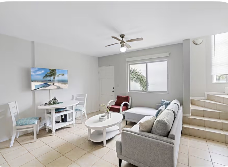 renovated open-concept living and dining area, a fully equipped kitchen, a laundry room, anda guest bathroom. On the second floor, you’ll find two bedrooms, each with en-suite bathrooms.