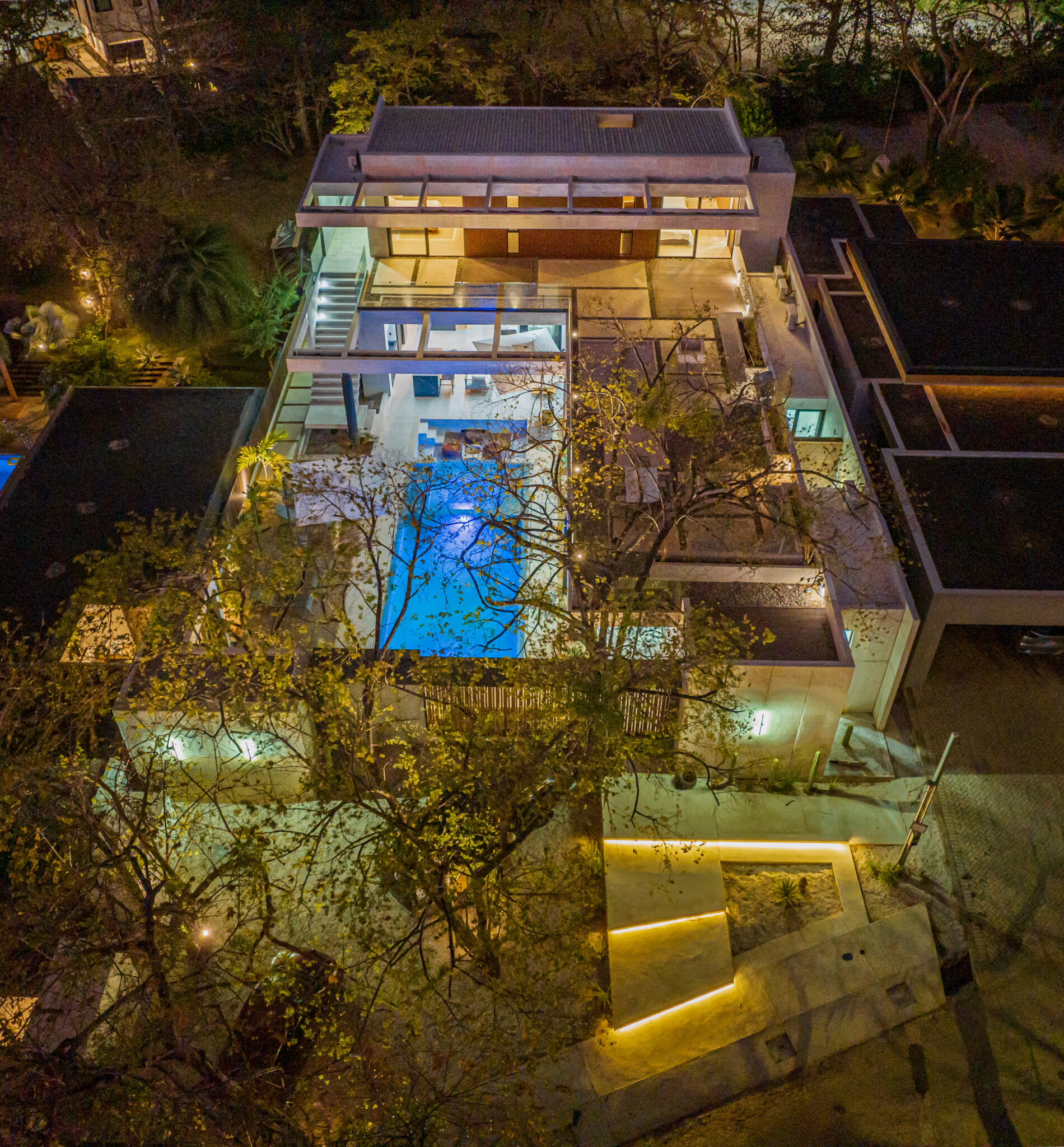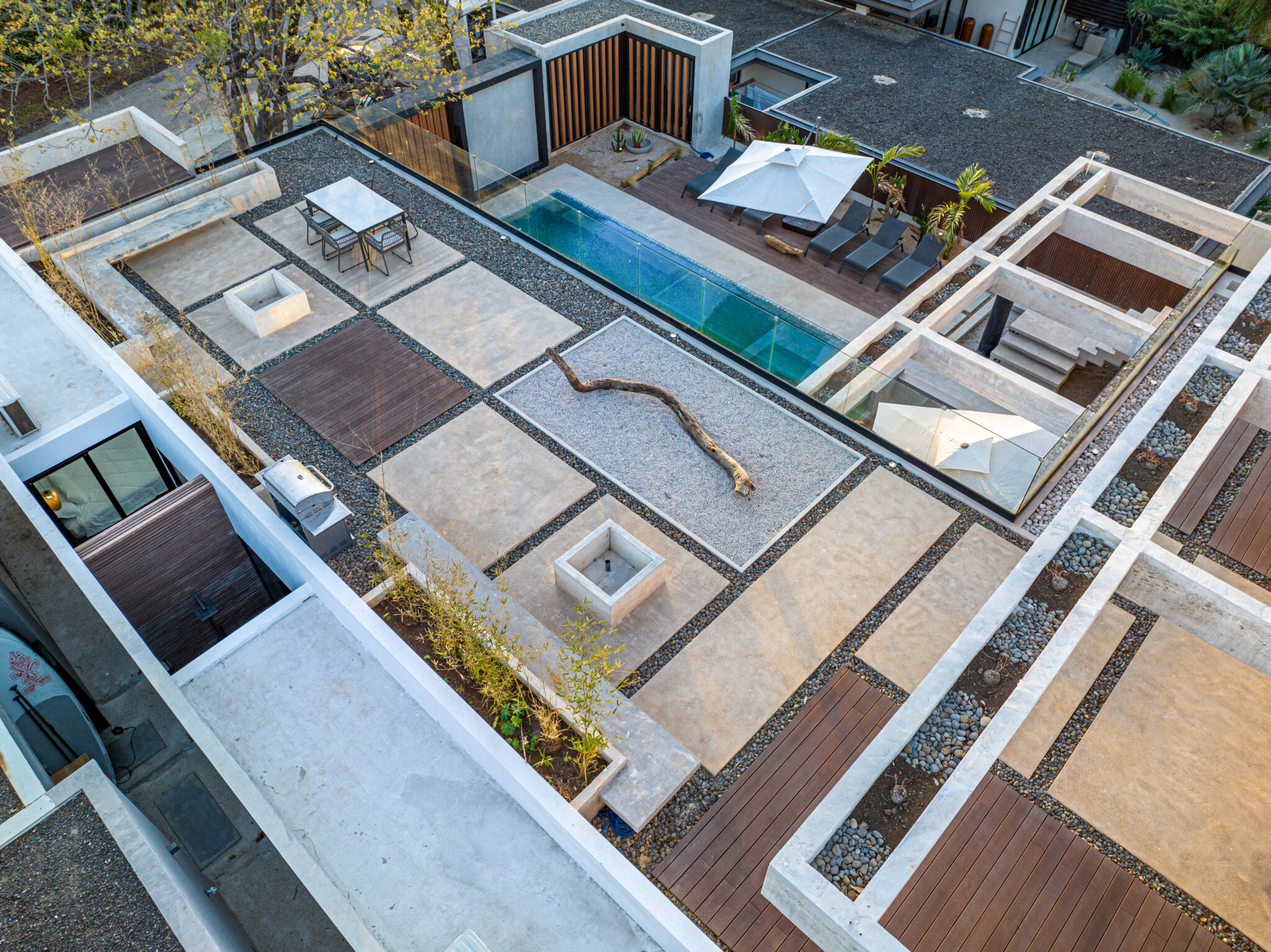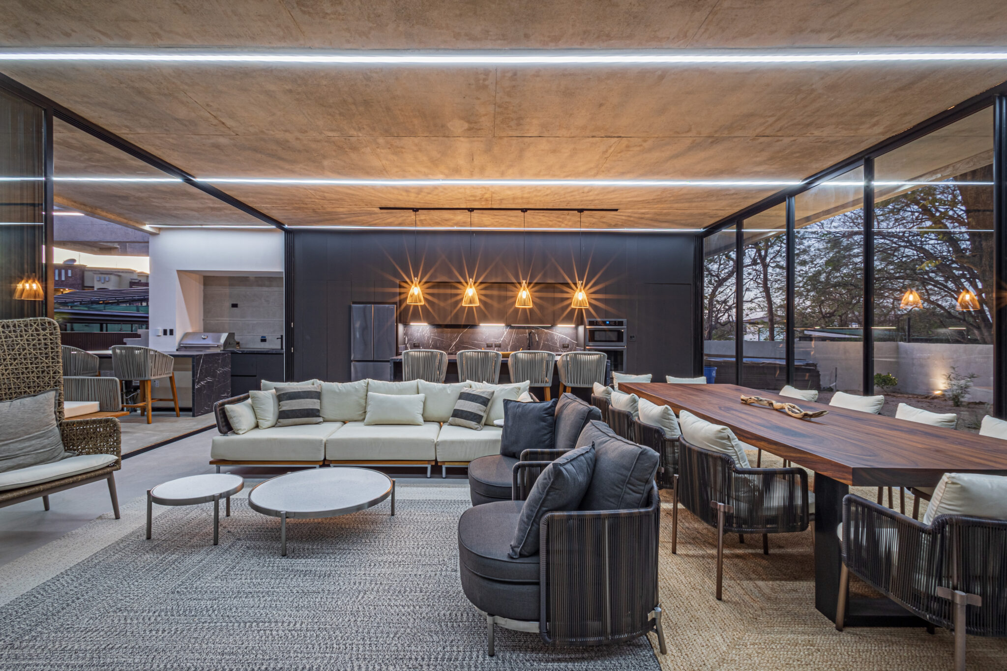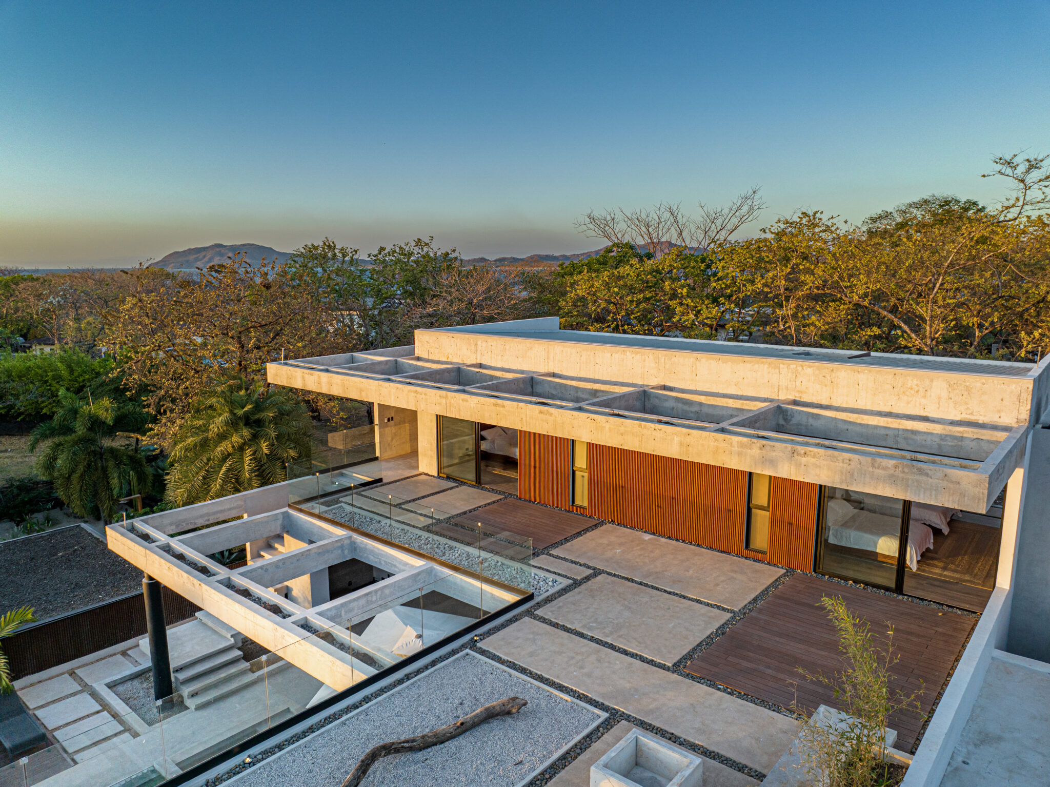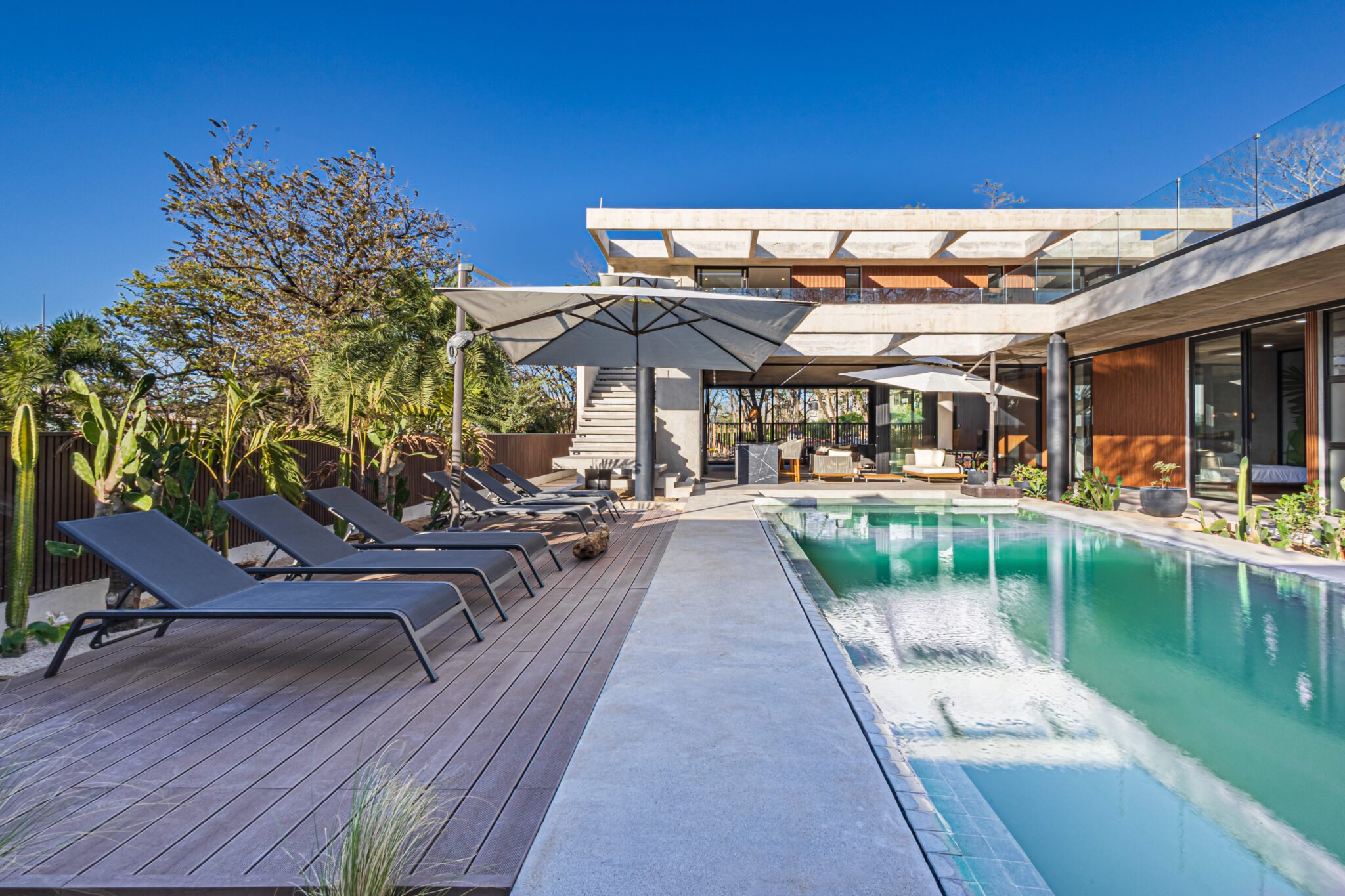 The houses centerpiece is a large pool with surrounding patio that integrates perfectly with the interior living spaces. The pool is the perfect place to relax and unwind while enjoying the coastal ambiance. Floor to ceiling windows throughout allows a lot of light and the chance to enjoy the natural surroundings. The second floor large terrace, offers a peek at the ocean and a perfect space to enjoy amazing sunset colors. The terrace is a private sanctuary that leads to the 2 second story bedrooms. The construction includes polished concrete surfaces that bring a contemporary elegance. The kitchen and bathrooms have beautiful black marble tops along with teak wood accents that create a beautiful balance through the entire home.