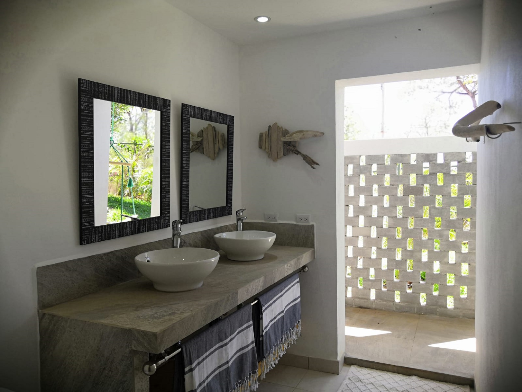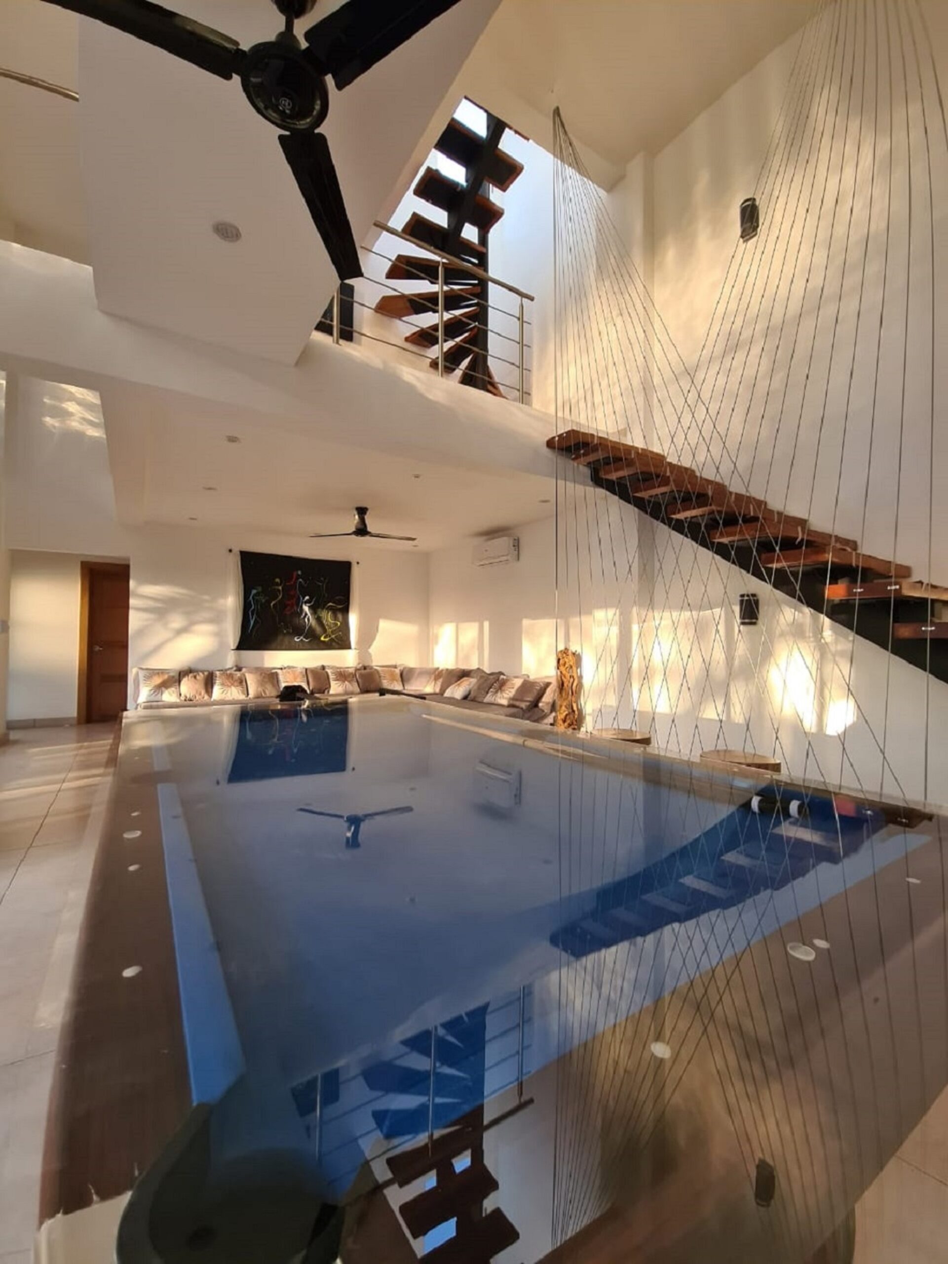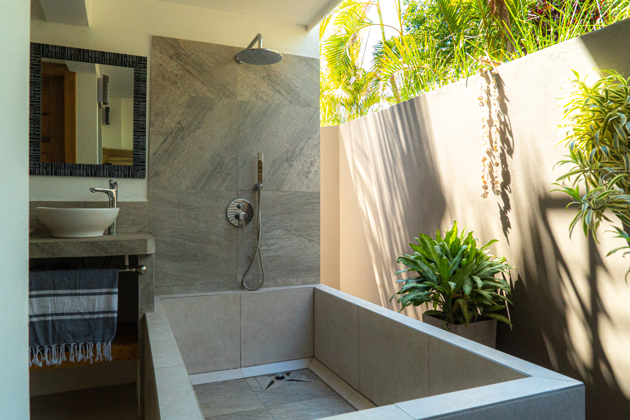 The lower floor of this luxury villa is accessible going down the stairs, it has one bedroom with a queen bed and outdoor bathroom. The second floor has 2 bedrooms with each one an outside bathroom and the stairs to access the rooftop terrace.