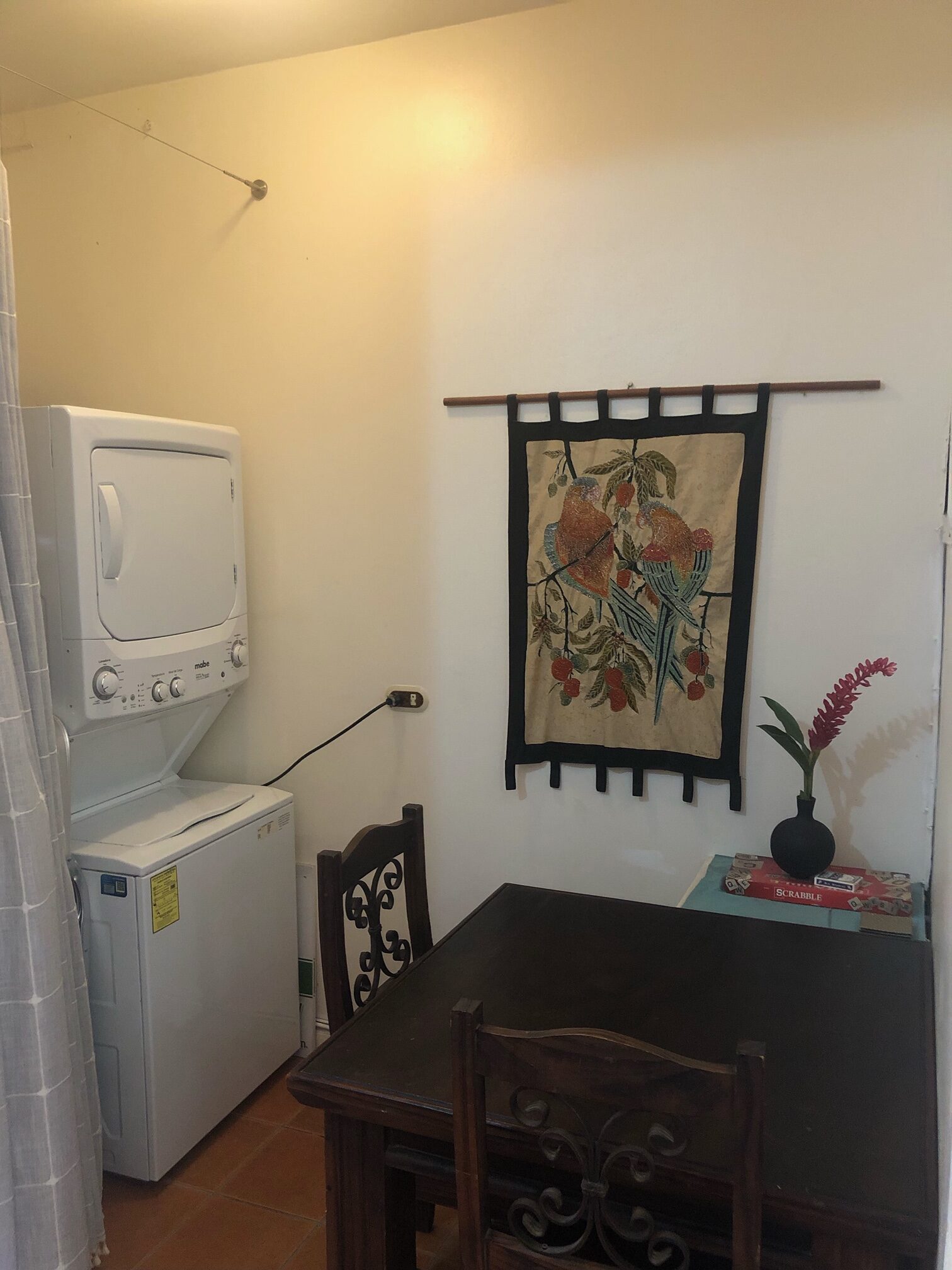 The property features an open floor plan downstairs with a full kitchen, living room, and dining area. The kitchen has stainless steel appliances along with a comfortable breakfast bar. There is a stackable washer and dryer for your convenience and a small back porch with water reserve tank and outdoor sink. The second floor has 2 bedrooms each with their own ensuite bathroom and spacious closets. The master bedroom has a small balcony which overlooks the pool and colorful gardens that surround the complex.