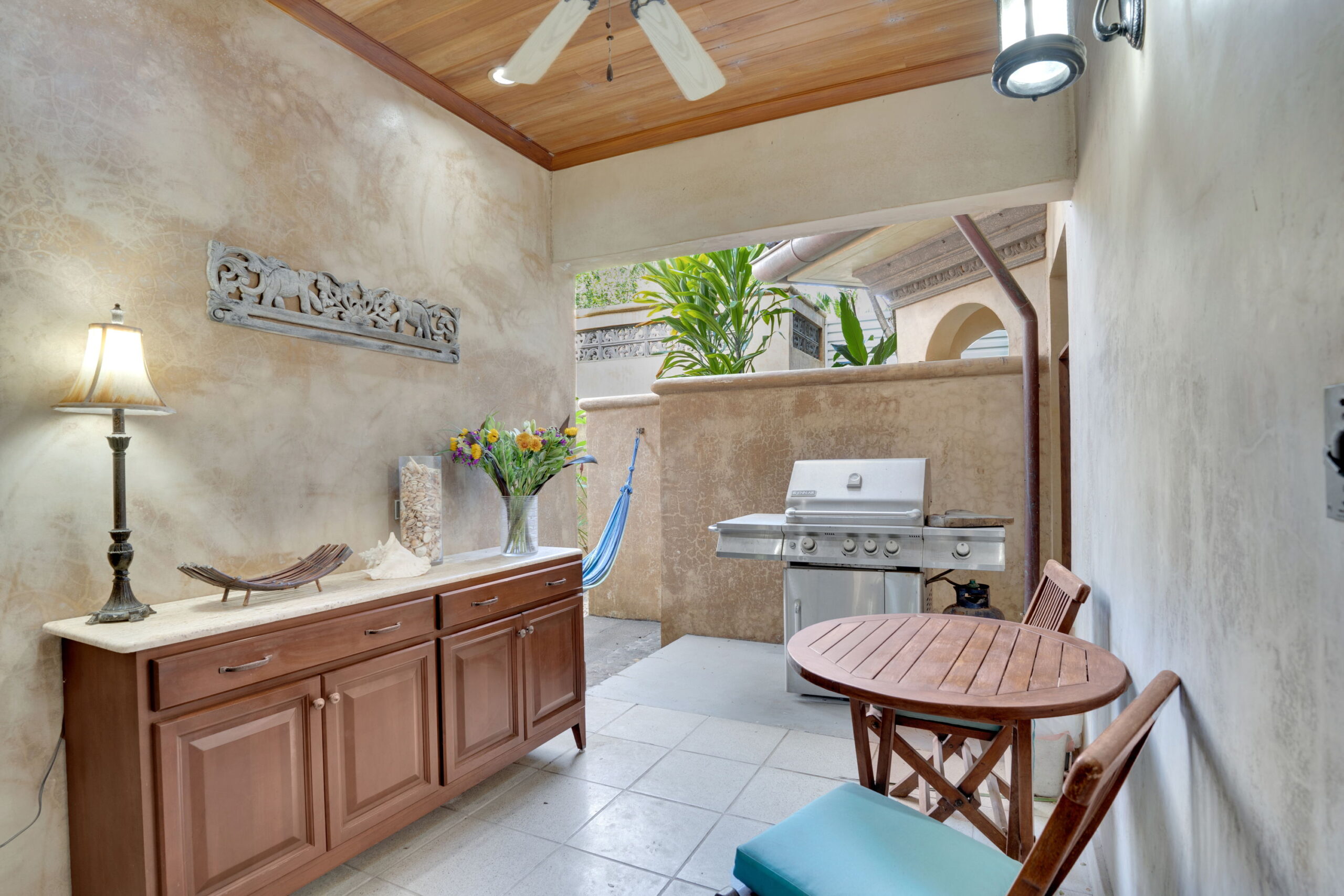 The kitchen oozes quality throughout. From the bespoke hardwood cabinetry to the stainless steel appliances which are complimented by the extended granite counter tops and breakfast bar, comfortably seating five people. The back patio and BBQ area is accessed by the wooden framed glass sliding doors directly off the kitchen. There is a gas grill, a table for 2 and a solid hardwood free standing cabinet with granite work top. Perfect for grilling and food preparation. There is also a secondary private garden adjacent this patio with hammock hooks installed for maximum relaxation. This patio can also be accessed via the guest bedroom's glass sliding doors.