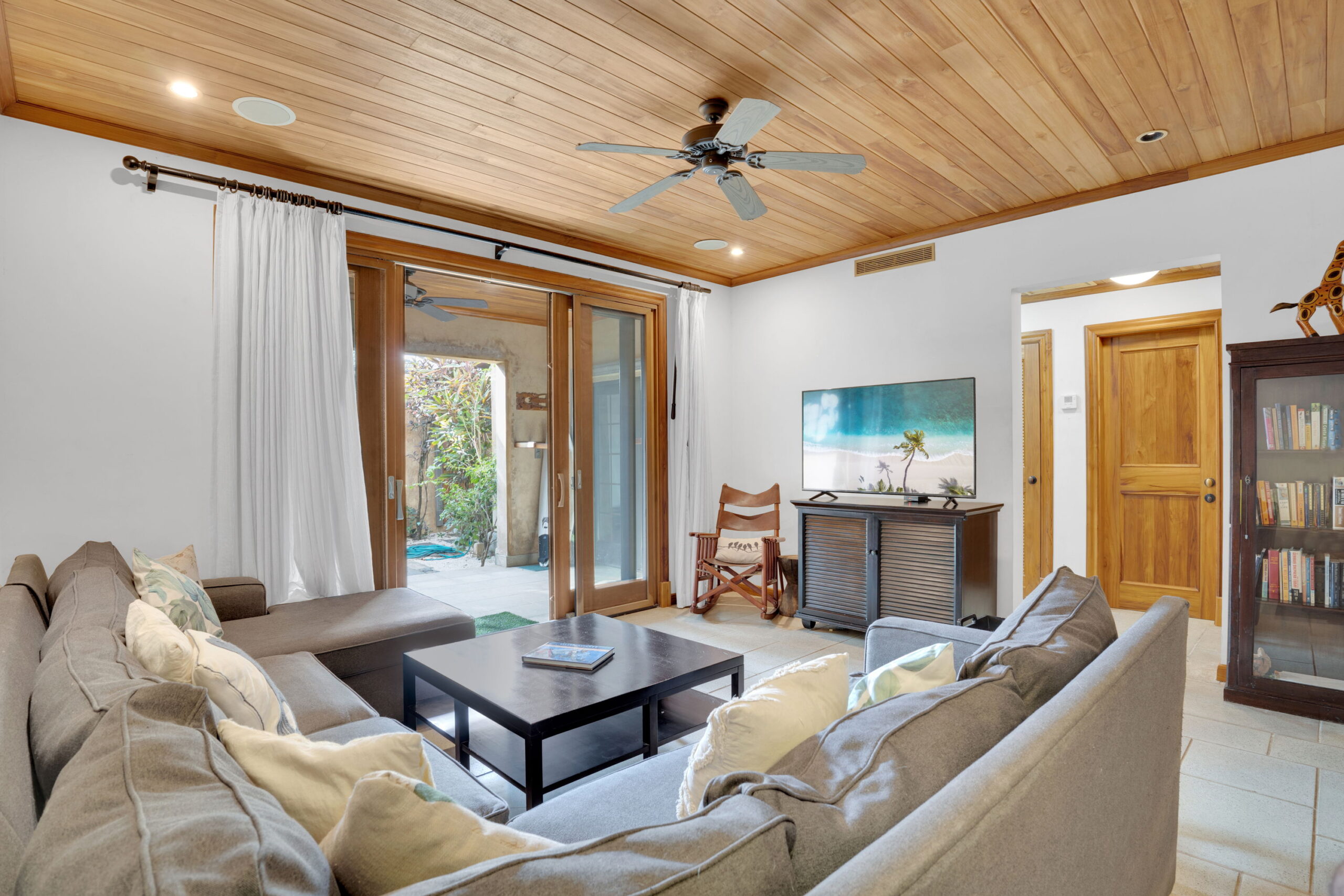 This spacious ground floor 2 bed 2 bath home comes lavishly furnished with quality being selected over price. From the moment you walk into the home you will notice the exceptionally well kept hard wood teak ceiling and trim throughout which are illuminated by natural light coming through the sliding doors leading to the front and rear patios.
