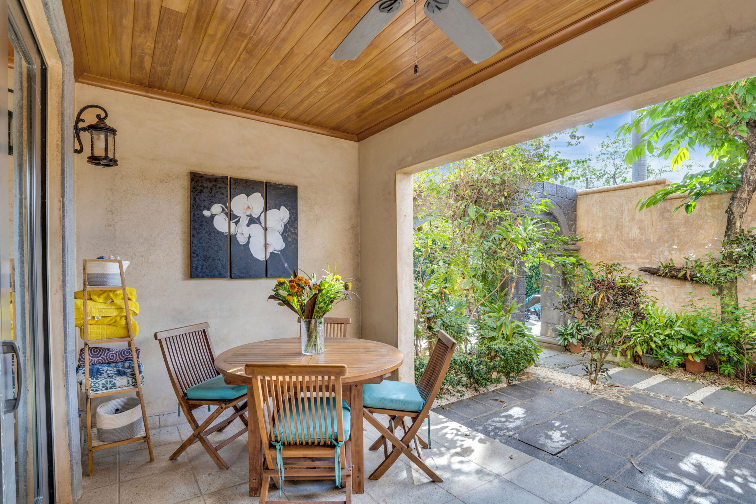 The living area is very stylishly furnished with a newer top quality fabric L shaped couch, traditional Costa Rican style rocking chair and hardwood storage & TV chest. The front patio is accessed through large screened glass sliding doors and is set up as an outdoor dining area with an expanding hardwood dining table for 4-6 people. This patio is accented with a teak ceiling and ceiling fan.