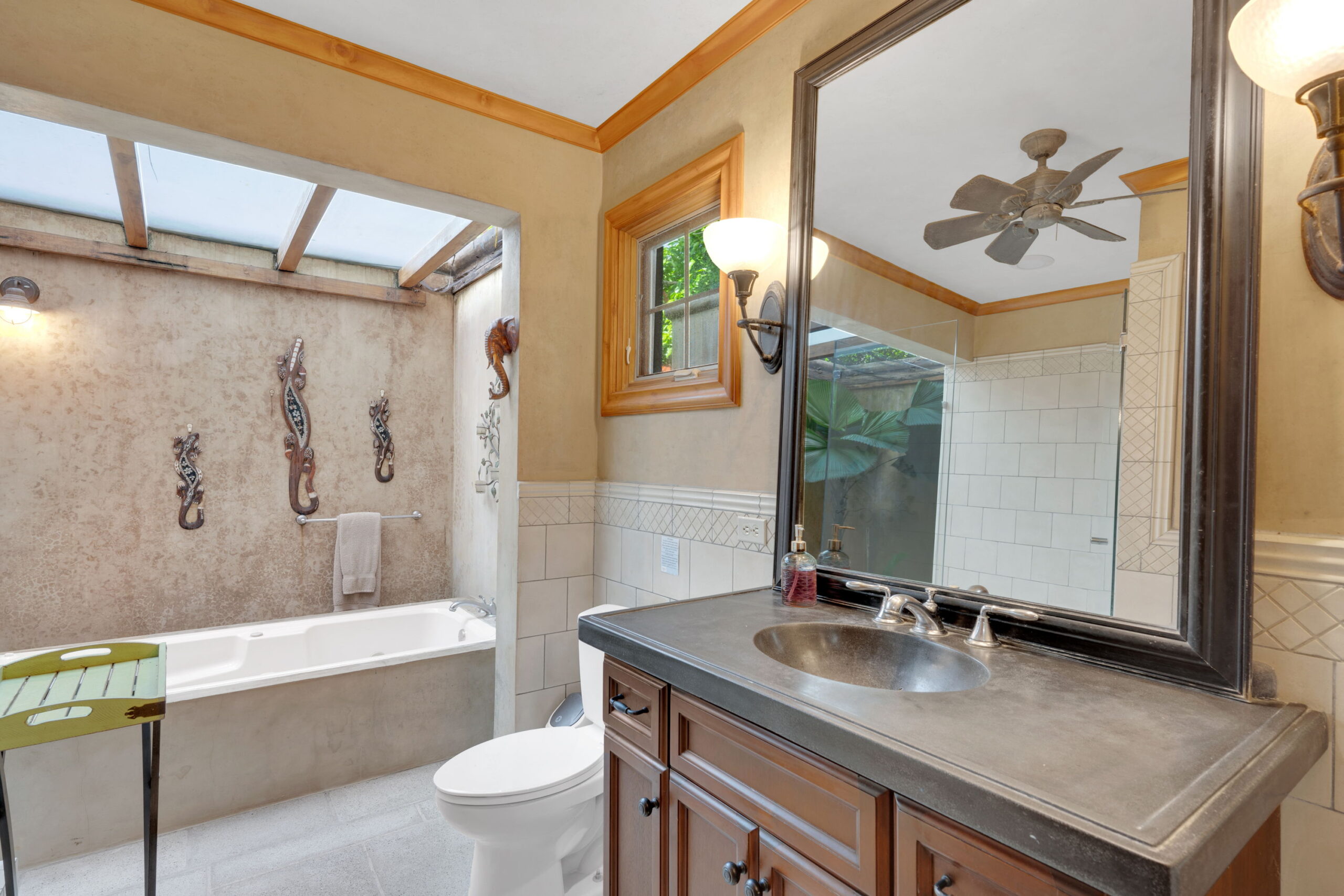 There are 2 very spacious indoor/outdoor bathrooms. They look and feel very tropical. The front bathroom boasts both a bath tub and a large shower.