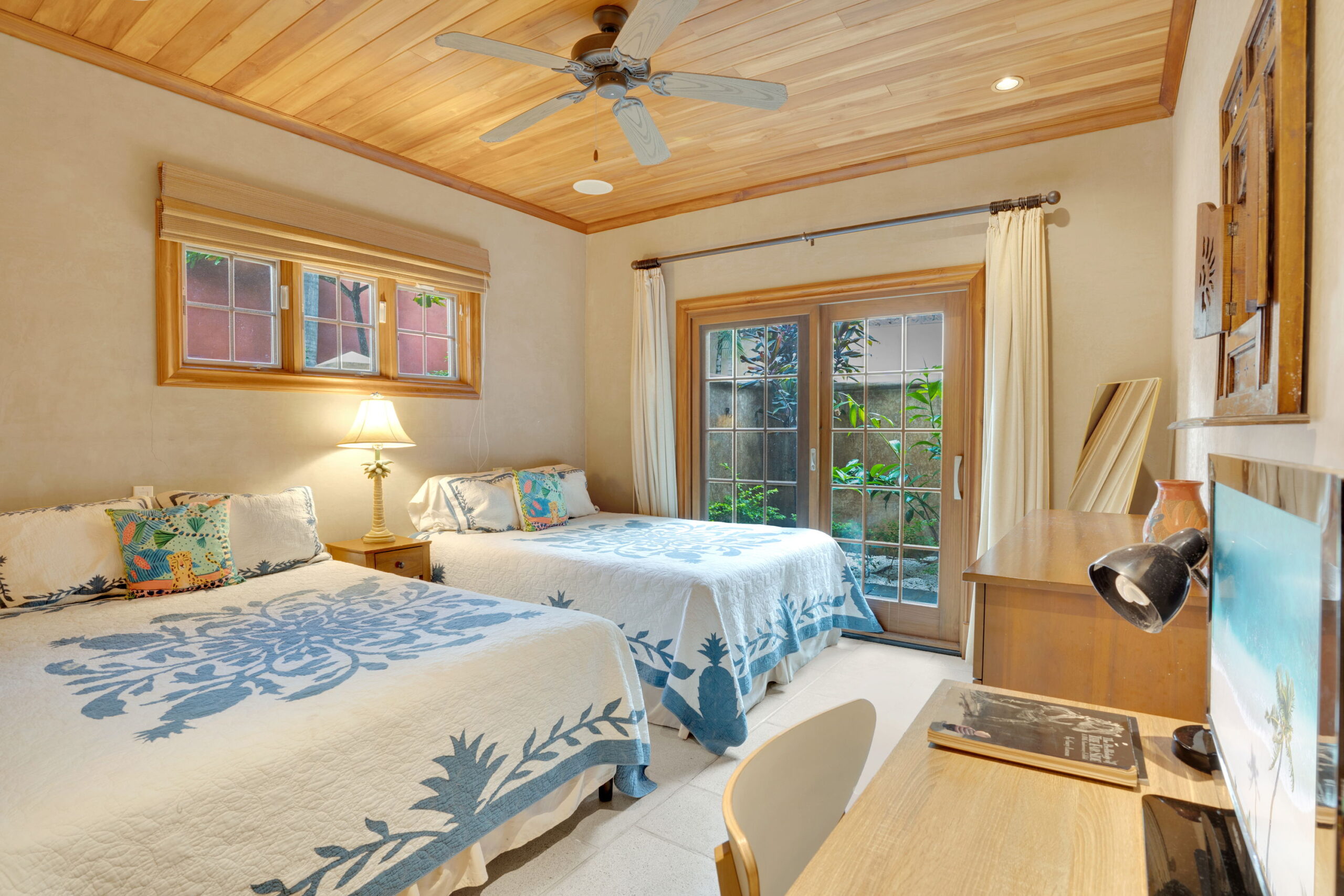 The guest bedroom also has lots of natural light with sliding door access to the private back garden area. It is currently set up with 2 queen beds to increase rental revenue, has a built in closet and access to a private indoor/outdoor garden bathroom with a shower and a linen storage cabinet.