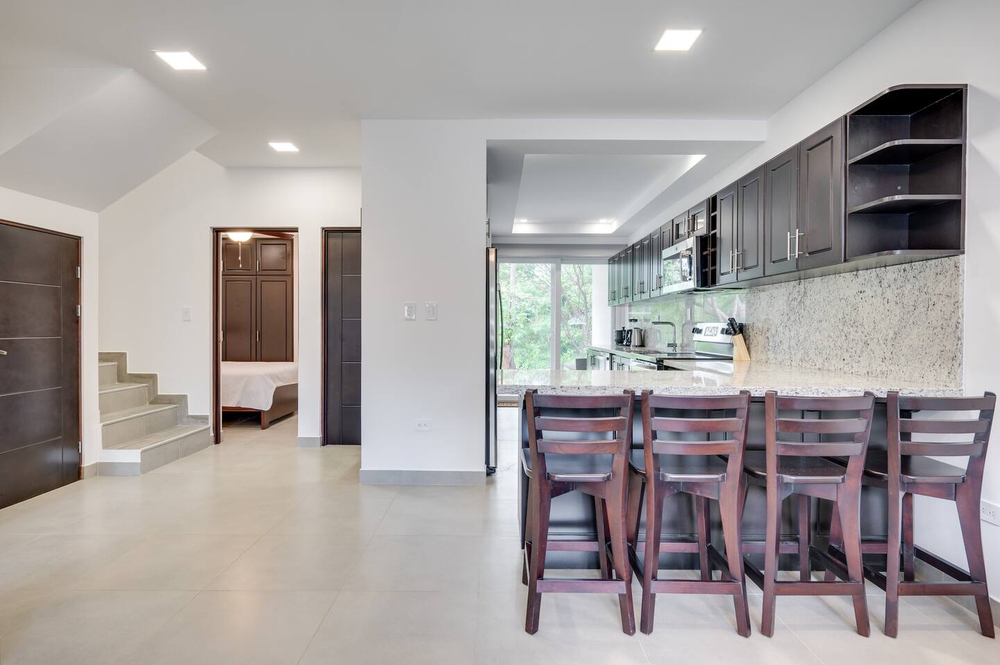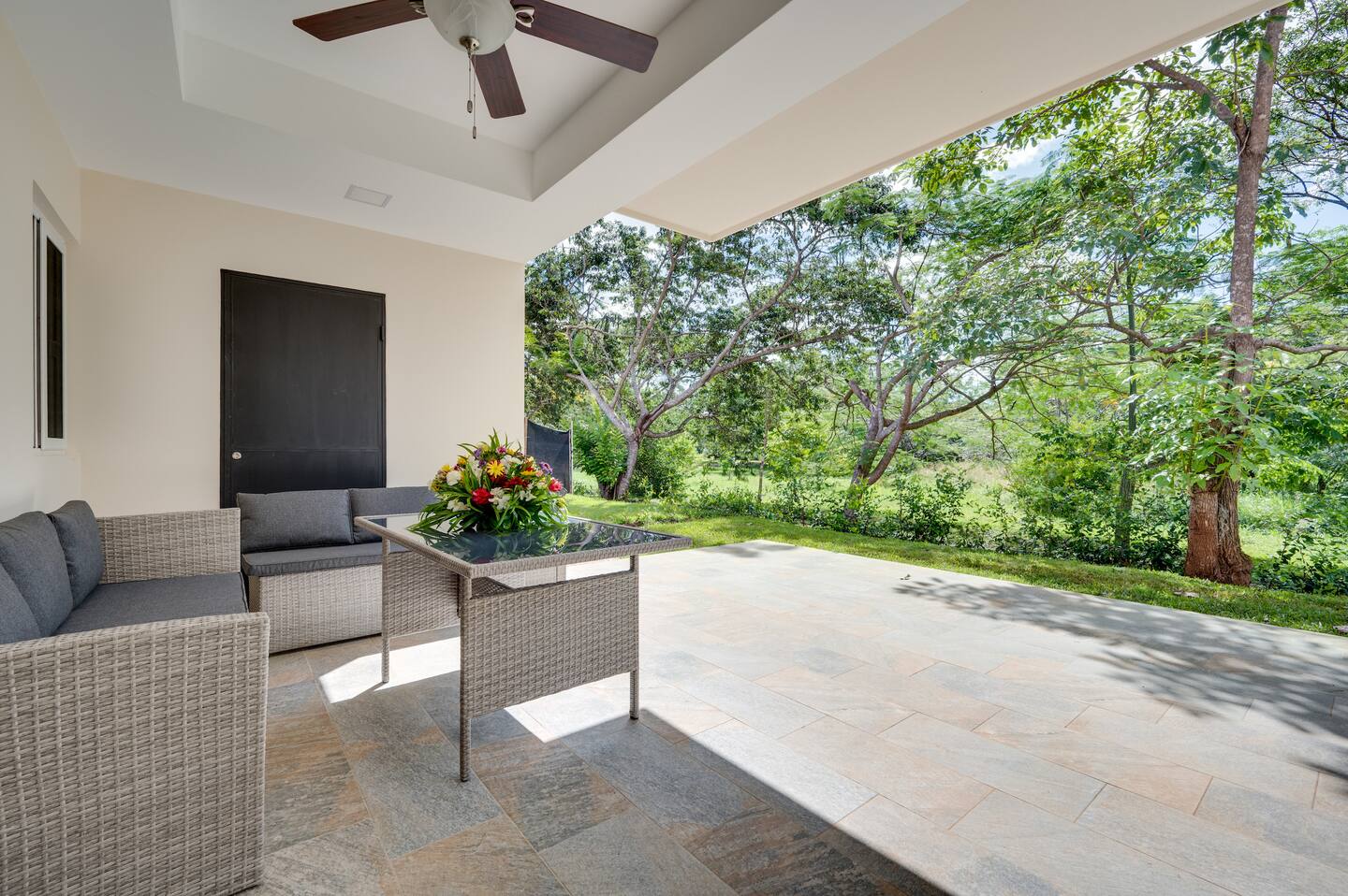 bar, two bedrooms, and two bathrooms. The back terrace, facing a lush green space, is perfect